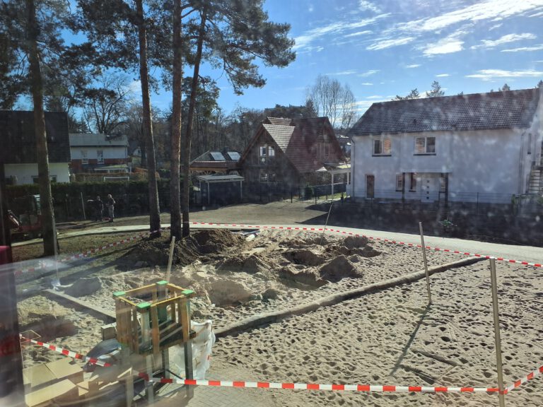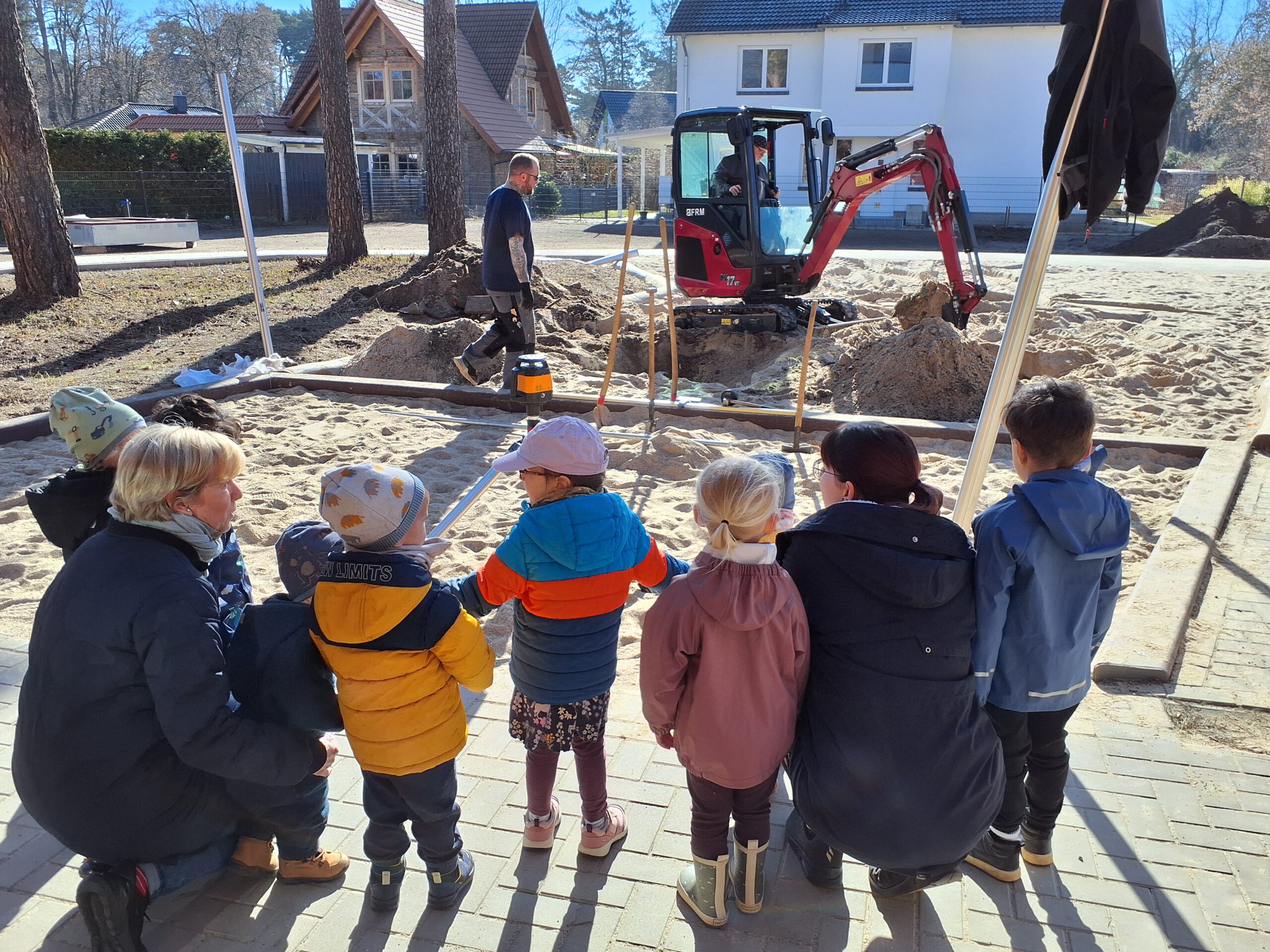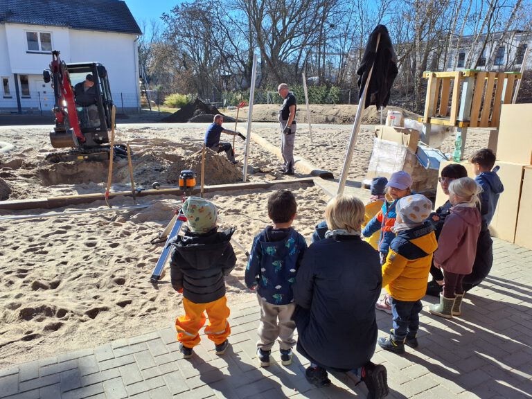 Dabei stellen sich viele wichtige Fragen: Wie tief gräbt der Bagger wohl? Wann kommt die Rutsche dran? Und das Wichtigste: Wann dürfen wir endlich losstürmen? Die Vorfreude wächst mit jedem Tag!