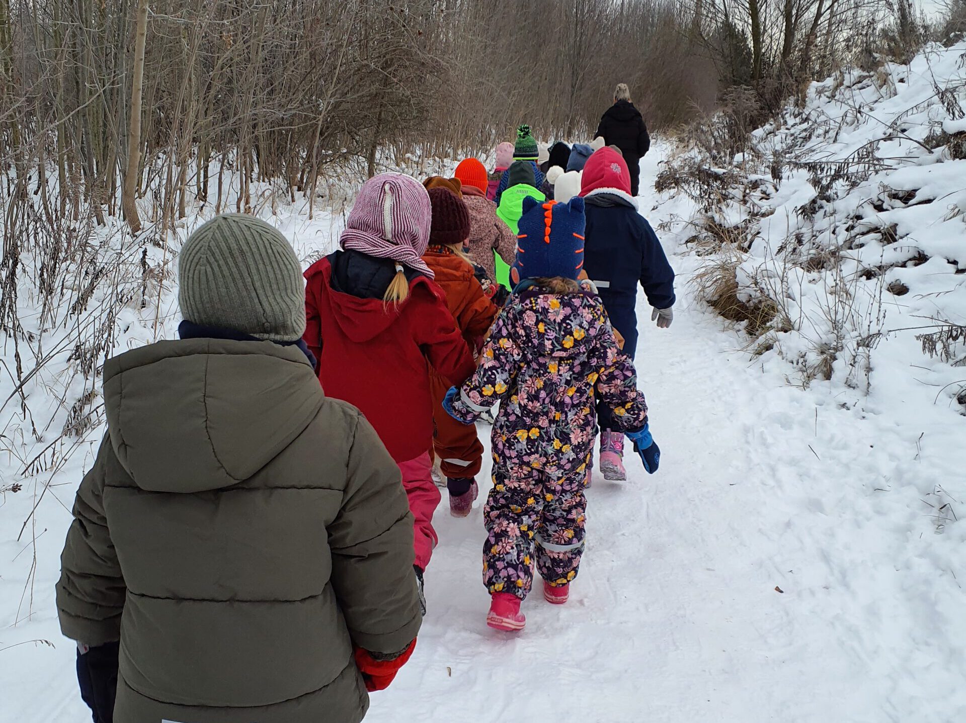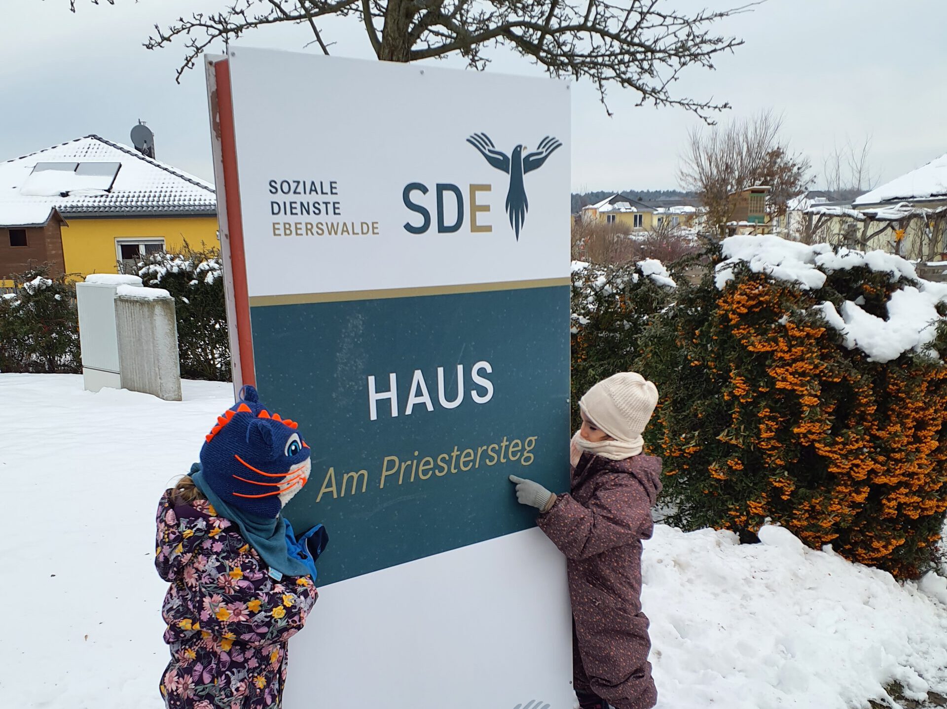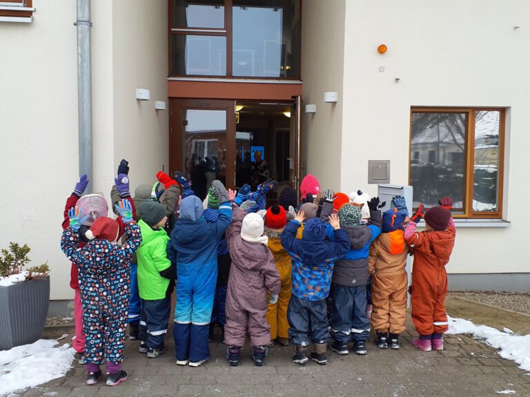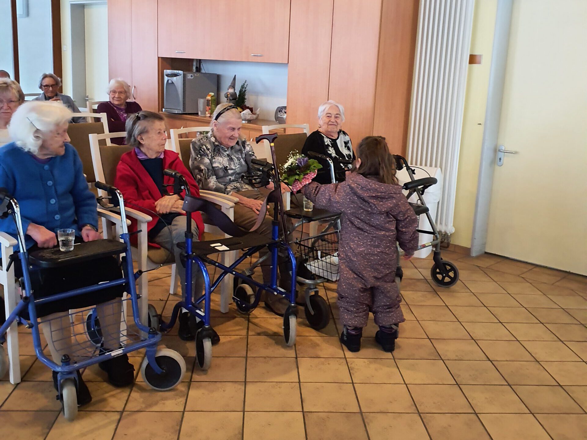 Von unserer Kita aus liefen wir einen kleinen, verschneiten Schleichweg entlang und erreichten unser Ziel bereits nach etwa zehn Minuten. Schon im Eingangsbereich zauberten die Kinder in ihren bunten Schneeanzügen vielen Seniorinnen und Senioren ein Lächeln ins Gesicht.