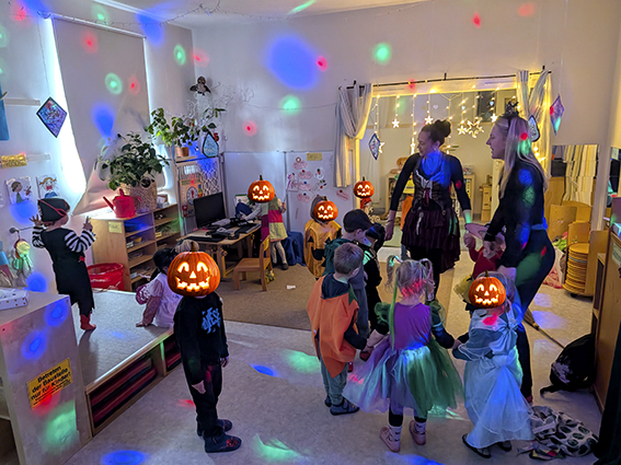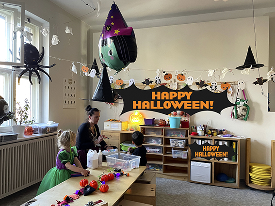 Schaurig schön war unsere diesjährige Halloween-Party, die in den älteren Gruppen zelebriert wurde. Die etwas jüngeren Kinder im U3-Bereich feierten „Halloween light“ ohne Grusel, aber mit vielen Kostümen und viel Spaß. Aber egal, ob mit Grusel-Faktor oder ohne, es gab überall Musik und wir tanzten zu den neuesten Hits von Simone Sommerland. Außerdem standen Kinderschminken und Halloween-Tattoos auf dem Programm und es gab ein riesiges Buffet. Nur unsere Kleinsten in der Krippe verbrachten den Tag genauso, wie jeden anderen – kuschelig, entspannt und absolut Geister-frei.