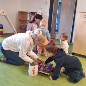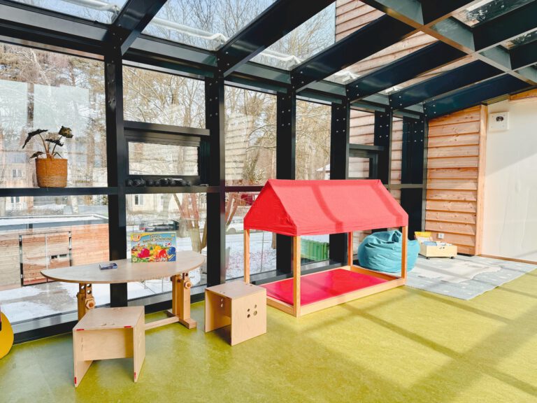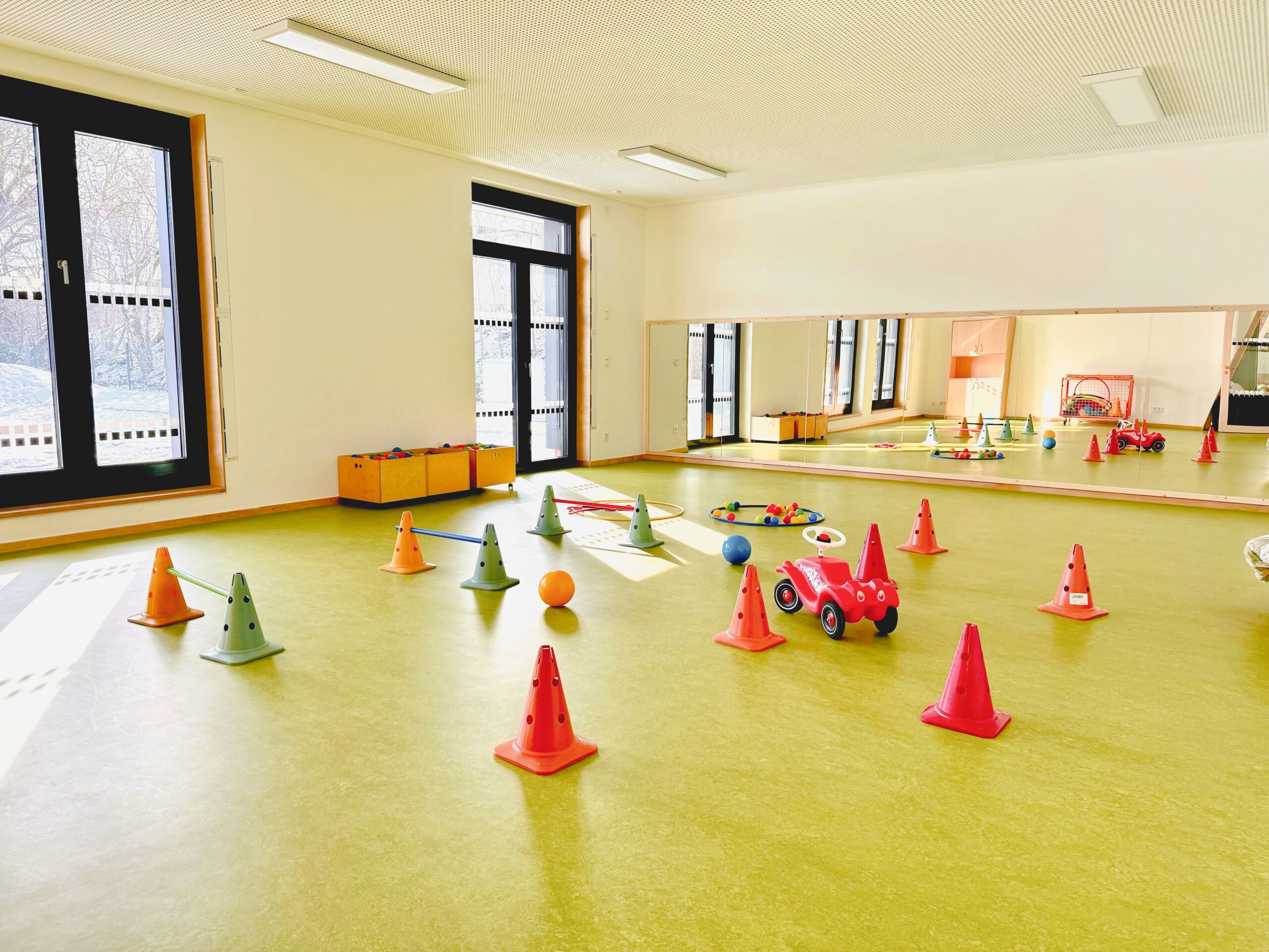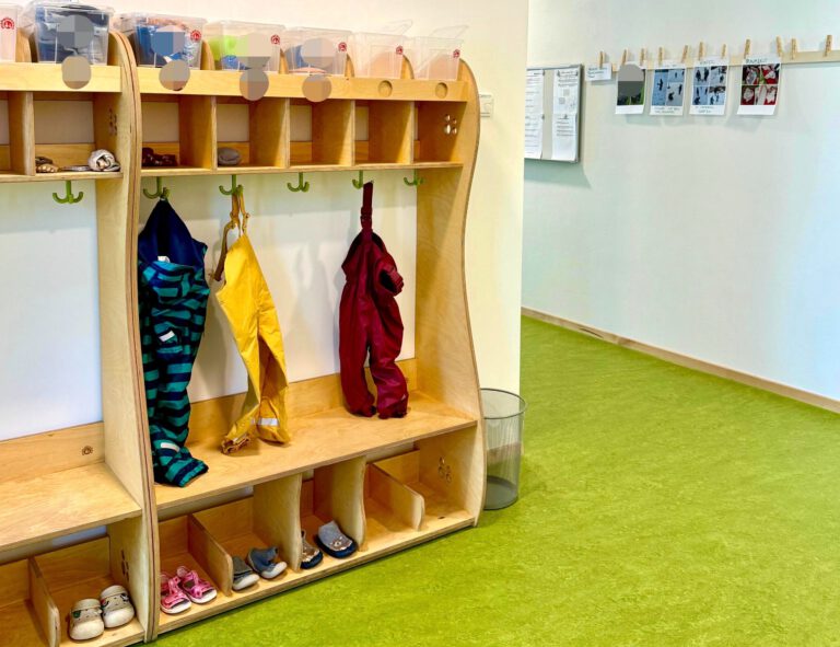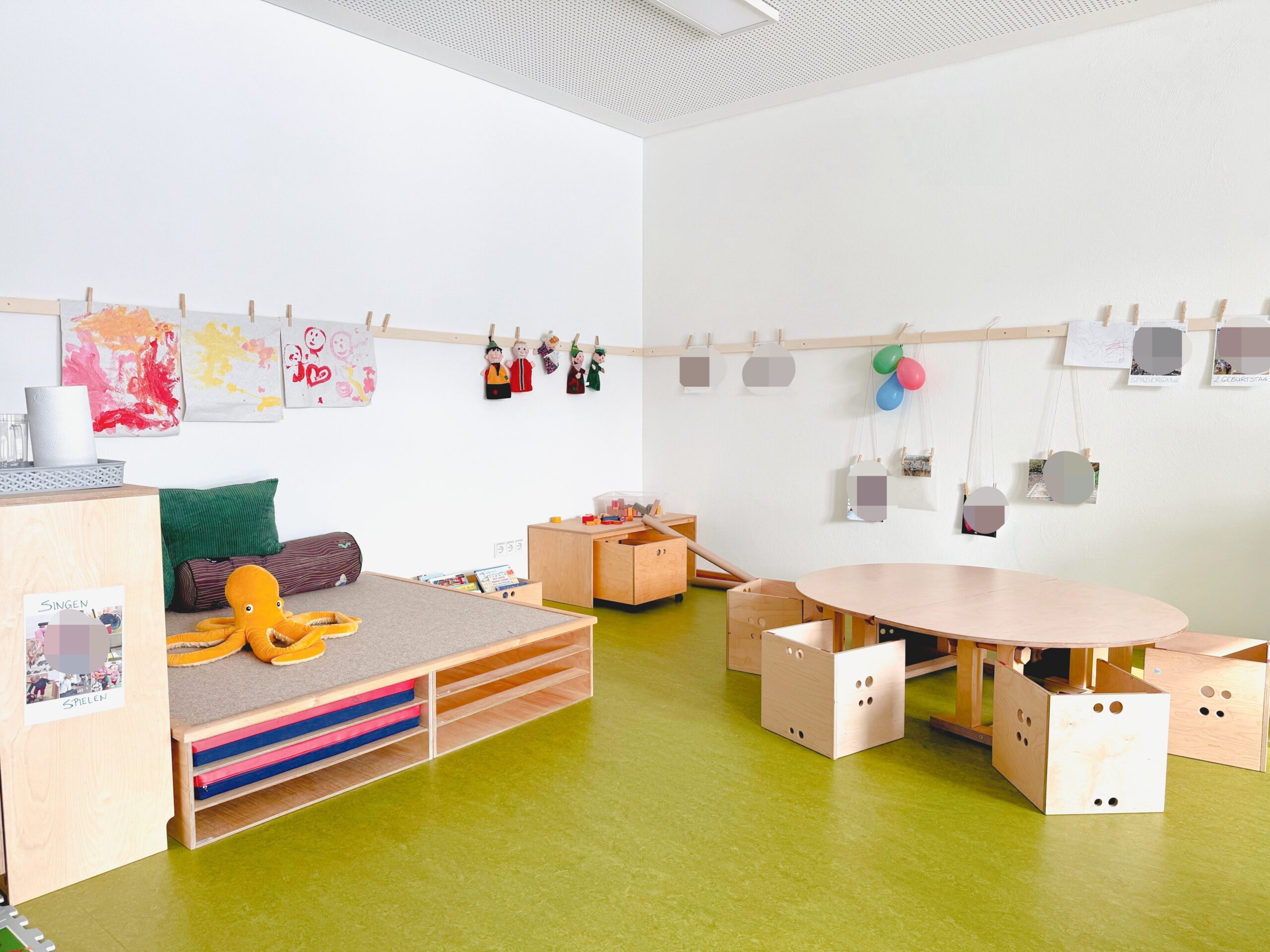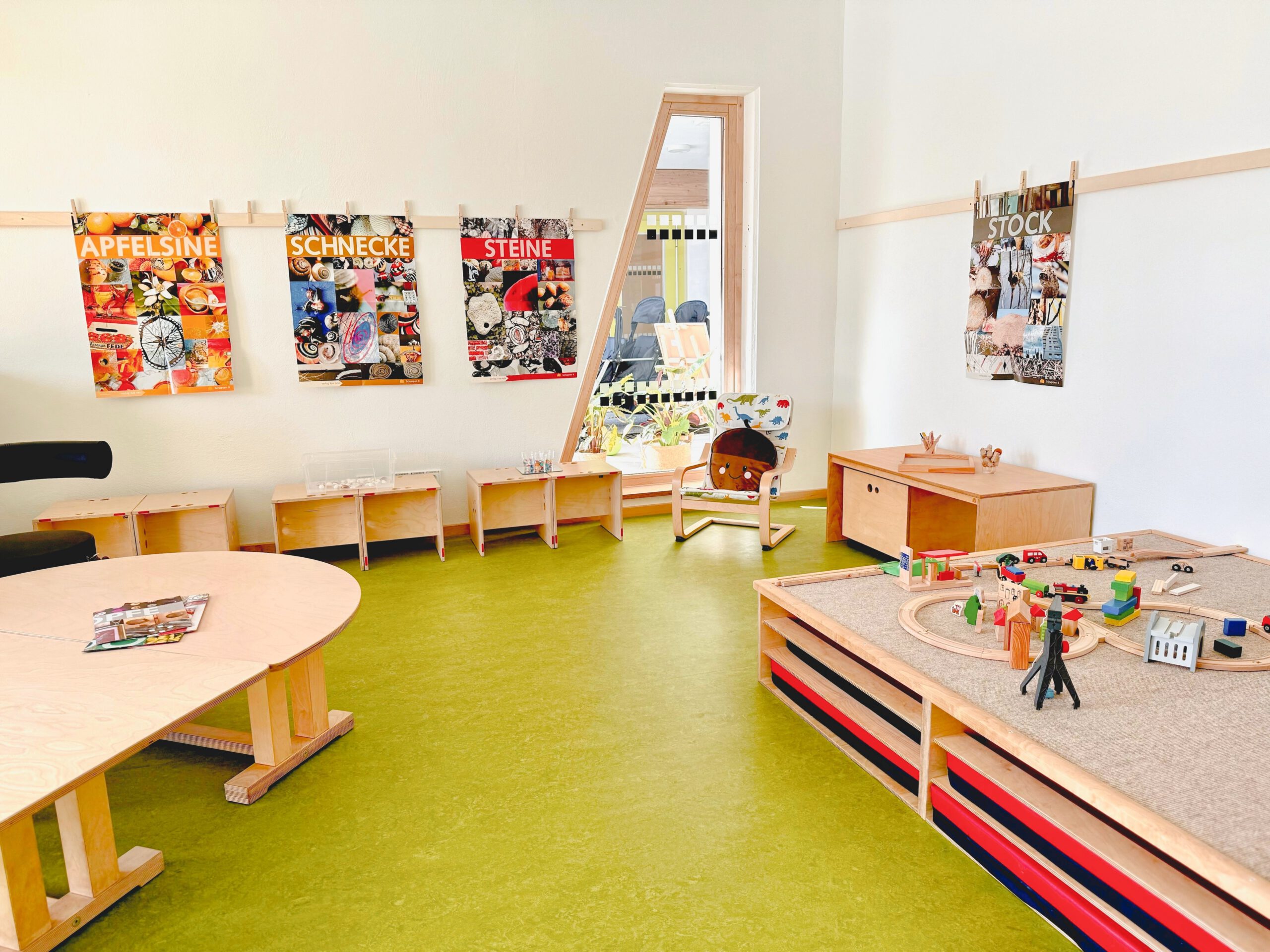 wöchentliche Krabbelgruppe schon vor Kitastart; großer Bewegungsraum und Garten mit Terrassen und Hochbeeten; selbstkochende Einrichtung mit eigener Frischkochküche; gläserner Lichtweg mit Bücher- und Entspannungsecke und Reggio-Materialmarkt; moderner Bau mit klimafreundlicher Holzfassade
