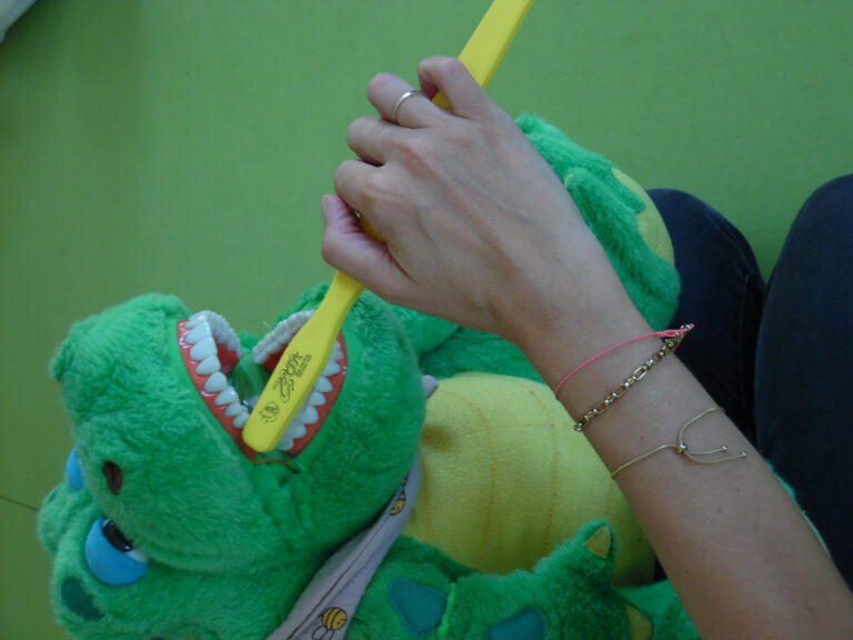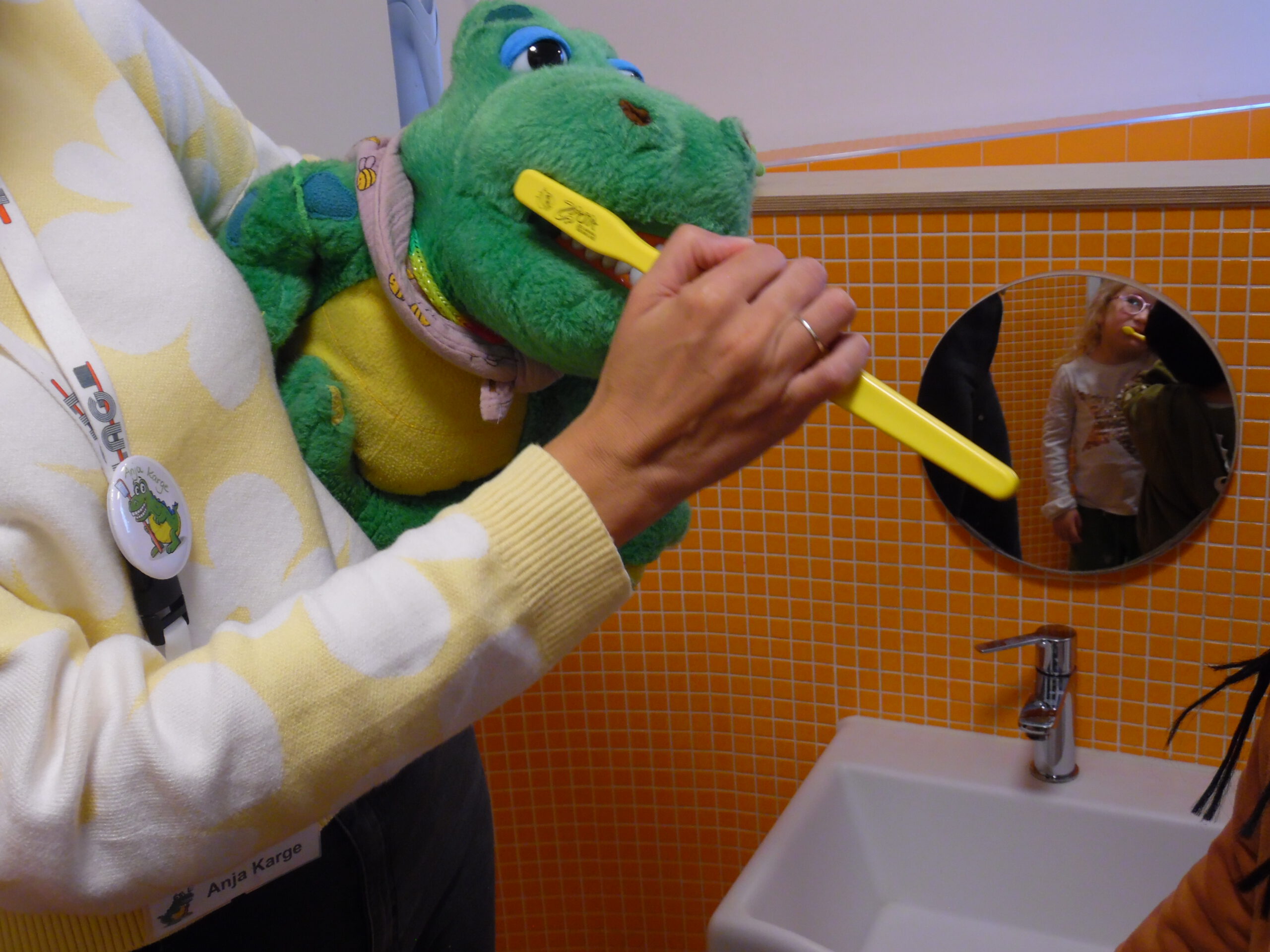 Mit viel Spaß und guter Laune hat Kroko den Kindern das Zähneputzen gezeigt und natürlich auch gemeinsam mit ihnen geübt.