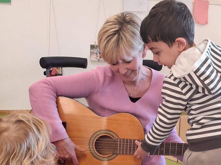 Schon jetzt gehören unsere Singrunden fest zum Tag: Erste Lieder werden täglich wiederholt, von den Kindern eingefordert und mit Freude zur Gitarrenbegleitung gesungen.